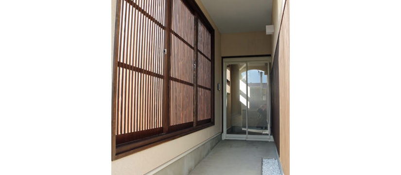 純和風造りの佇まいで、軒から通路を長く屋根庇を張り出した「ガンギ」をモチーフに