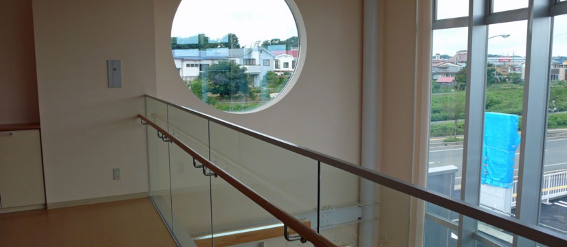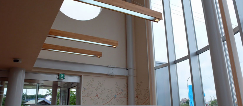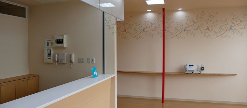吹き抜けの待合室には、小鳥たちを描いた内装材を使用したことにより