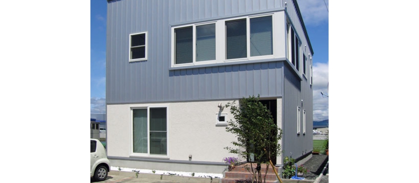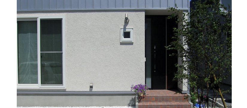 シンプルな外観に独自性を加えようと、外壁材と屋根材を一緒にし、玄関廻りには