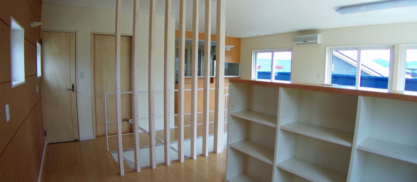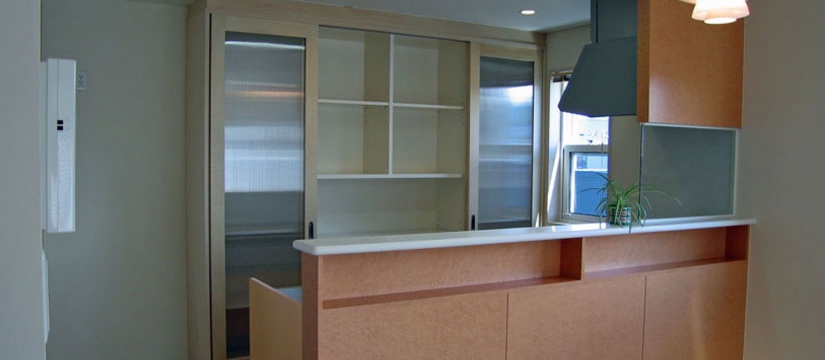 間仕切用の壁面本箱、飾り棚や食器棚など、家具・建具は室内と一体化した配色と