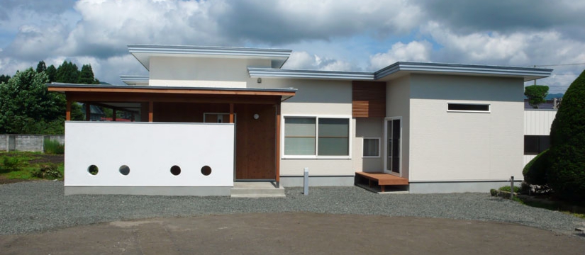 白地にリングで抜いた目隠し壁と奥の深い庇、高さの違う屋根との構成は、