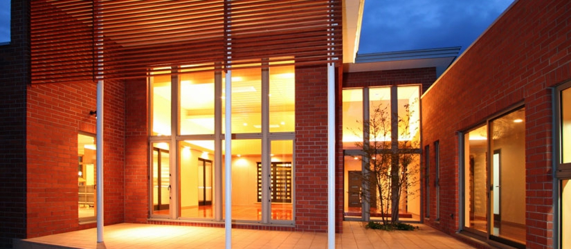 アプローチを奥深くとり、キャノピーのエントランスを備えた佇まいです。